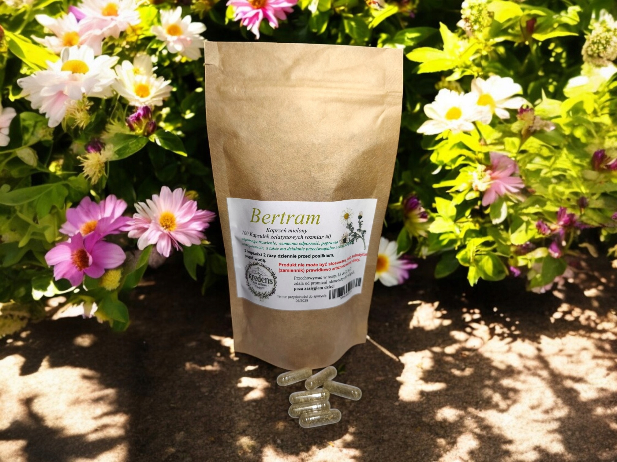 Bertram officinalis – Mediterranean medicinal herb Bertram officinalis is a plant that is cultivated today mainly in Mediterranean countries. In appearance, it somewhat resembles the well-known chamomile. In contrast, the medicinal raw material of bertram is not its flowers, but its root. Bertram has a characteristic, rather sharp taste and spicy aroma. In the powdered version, it is perfect for adding to many dishes. It can also be consumed in the form of a supplement, as well as in the form of a health infusion. The extraordinary properties of bertram were already known to medieval medicine. It was first described by the medieval mystic, St. Hidegard of Bingen. In her work entitled “Phisyca”, she recommended its use especially for people who want to improve their well-being, strengthen memory and concentration, and add strength. Bertram is also known and very popular in traditional Indian medicine, Ayurveda. Indian experts recommend its use, among others, to improve digestion. Bertram root helps cleanse the intestines of food residues, regulates digestion and supports better absorption of valuable nutrients from consumed food. Bertram and its valuable healing properties. Ringwort is a herb that is mainly used as a means of strengthening the functioning of our nervous system. Thanks to its extraordinary properties, powdered bertram root added to food has a positive effect on our memory, strengthens concentration, improves brain function and improves our intellectual skills. It can therefore be successfully used in the treatment of dementia and Alzheimer’s disease. It is also used to support the treatment of people affected by stroke. Another valuable property of bertram root is its positive effect on our well-being. This was already noted by St. Hildegard in the 12th century, when she recommended the use of bertram for people who suffer from poor health and often have mood swings. Today, bertram is used as a natural means of supporting the treatment of depression. Ringworm also has a positive effect on our immunity. It has antibacterial, antiviral and antiparasitic properties. Its regular use helps us build the body’s natural immunity, and when consumed during colds and infections, it allows for a faster recovery and minimizes the troublesome symptoms of the disease. Bertram is perfect for use, among others, during colds, coughs, in patients with asthma and pneumothorax.