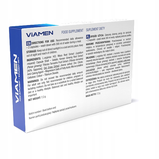 Viamen contains selected ingredients such as L-arginine, Tribulus terrestris, ginseng root, maca root, Avena sativa and zinc, which support sexual functions and increase libido.