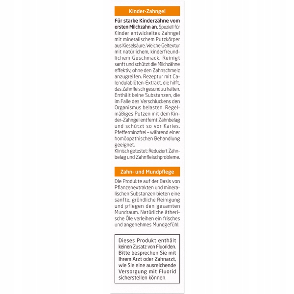 - For daily dental care: the children’s tooth gel has a mild fennel flavor and its consistency adapts to the child’s perception, making daily dental care easier for children and parents. The tooth gel does not contain fluoride